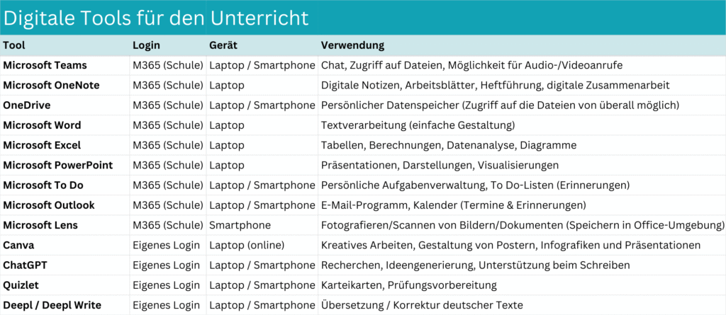 Übersicht der digitalen Tools, welche im Unterricht verwendet werden