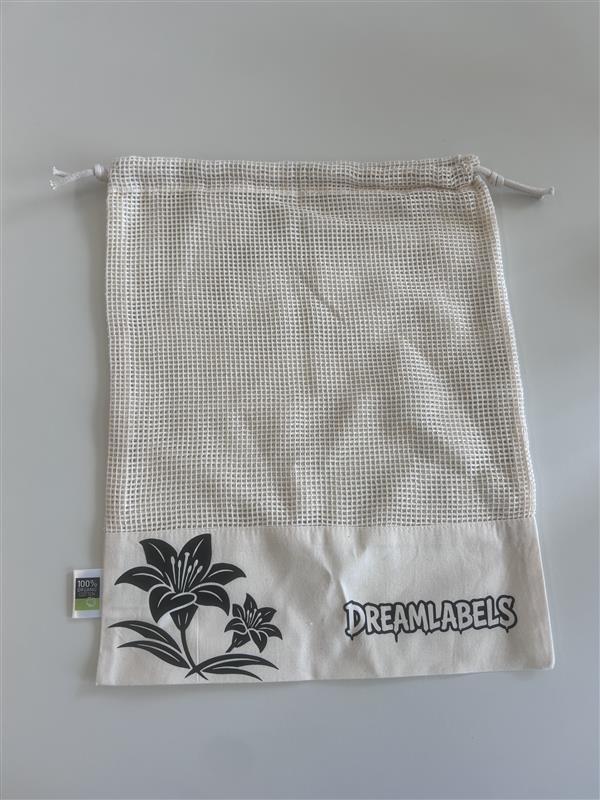 Beiger Stoffbeutel aus 100 % Bio-Baumwolle mit schwarzem Blumenmotiv und „Dreamlabels“-Schriftzug. Praktisch zum Aufbewahren von Gemüse oder kleinen Dingen.